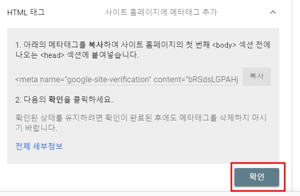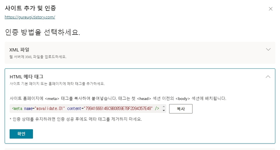 블로그에 메타테그를 붙여놓고 확인을 누르면