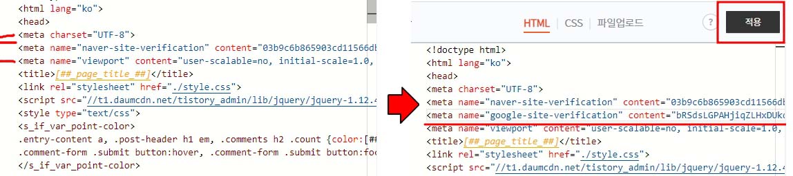 위와 같이 중간에 붙여 넣기를 해주시고, 적용을 누릅니다.