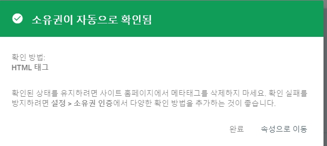 구글 서치 콘솔 1단계가 완료된 걸 확인할 수 있습니다.