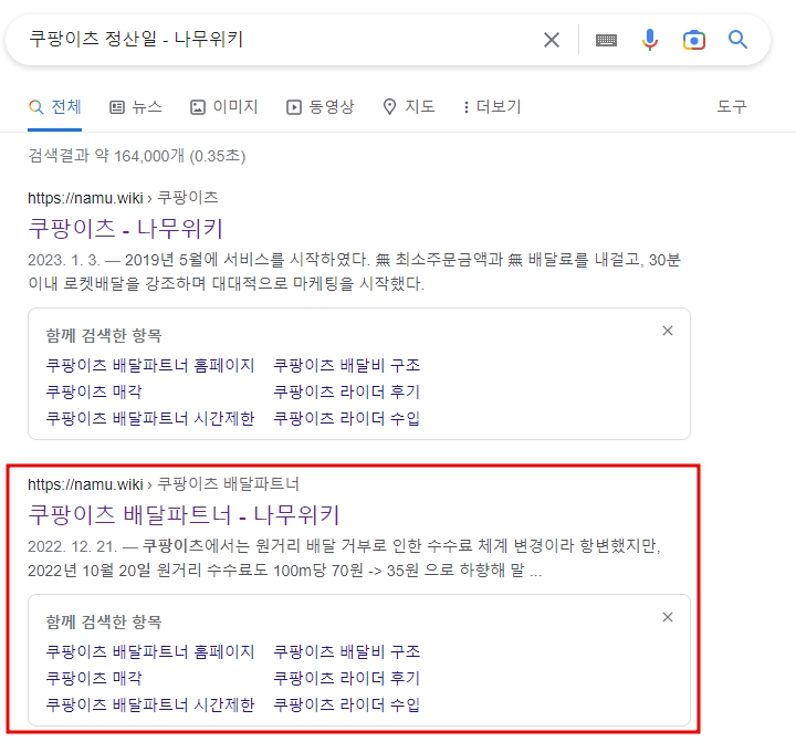 구글에서 '쿠팡이츠 정산일-나무위키'를 검색하면