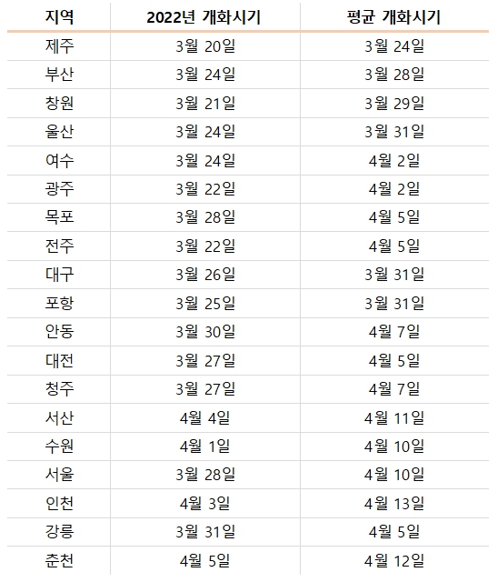 작년 2022년 벚꽃 개화시기를 보면 제주를 시작으로 인천까지 벚꽃이 개화하였습니다.