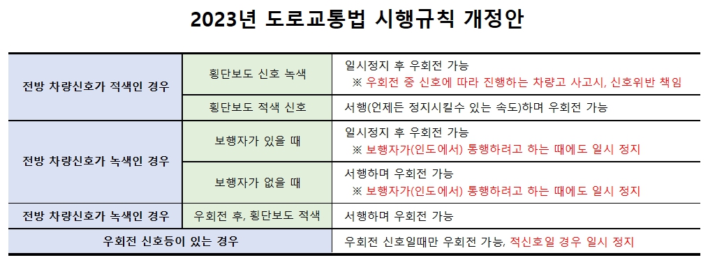 2023년 1월에는 우회전시 신호에 따른 정지 의무가 생겼습니다.